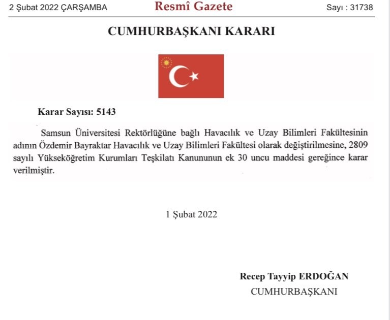 “Samsun Üniversitesi Rektörlüğü’ne bağlı Havacılık ve Uzay Bilimleri Fakültesi’nin adının ‘Özdemir Bayraktar Havacılık ve Uzay Bilimleri Fakültesi’ olarak değiştirilmesine, 2809 sayılı Yükseköğretim Kurumları Teşkilatları Kanunu’nun ek 30’uncu maddesi gereğinde karar verilmiştir.”