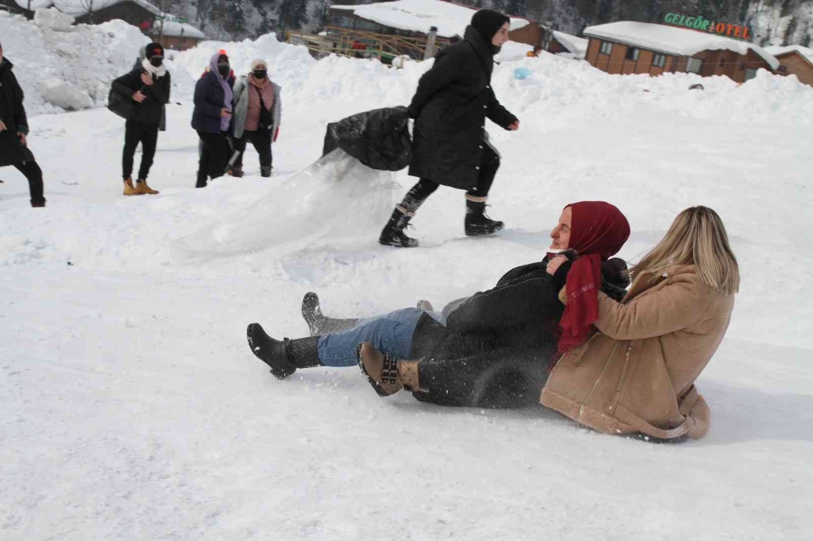 Vatandaşlar yanlarında getirdikleri muşambalar, naylon poşetler, çöp poşetleri ve şambrelleri ellerine alarak festival alanının bulunduğu tepenin en üst kısmına kadar taşıyarak karlı kaplı yamaçtan aşağıya kayıyor. Yarı yolda çarpışanların yanı sıra duramayanlar eğlenceli dakikalar yaşarken, izleyenlere de bir görsel şölen sunuyor. Kaymaktan çekinenenler ise müzik eşliğinde horon halkaları oluşturularak kar üzerinde eğlencenin tadını çıkartıyor.
