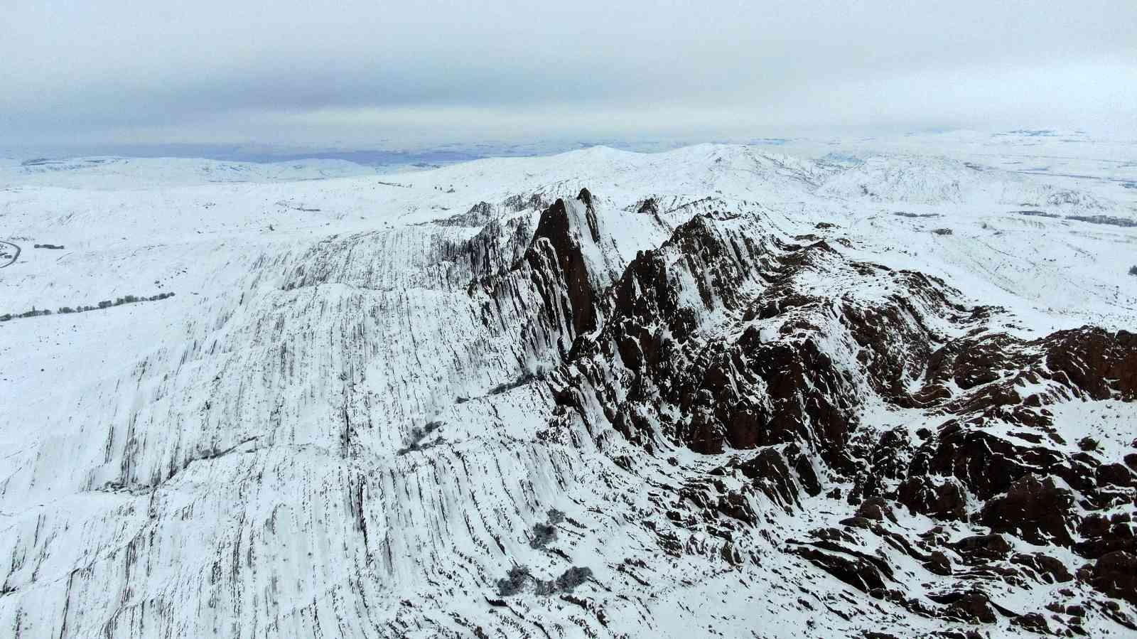 Sivas’ta kızıl rengiyle görenlerin dikkatini çeken ve Dünyadaki mars olarak bilinen Eğribucak-Emirhan kayalıkları kar yağışının ardından beyaza büründü