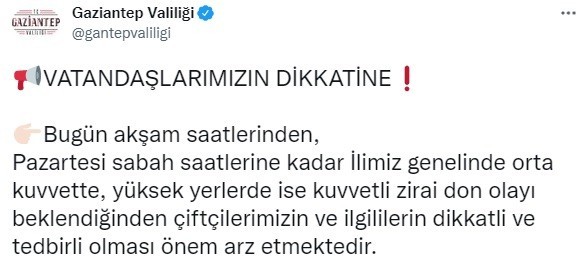 Gaziantep Valiliği sosyal medya hesabından yapılan uyarıda, kuvvetli rüzgara ve don olayına karşı vatandaşların dikkatli olması gerektiği belirtildi. Yapılan paylaşımda, “Vatandaşlarımızın dikkatine; bugün akşam saatlerinden, pazartesi sabah saatlerine kadar ilimiz genelinde orta kuvvette, yüksek yerlerde ise kuvvetli zirai don olayı beklendiğinden çiftçilerimizin ve ilgililerin dikkatli ve tedbirli olması önem arz etmektedir” ifadelerine yer verildi.