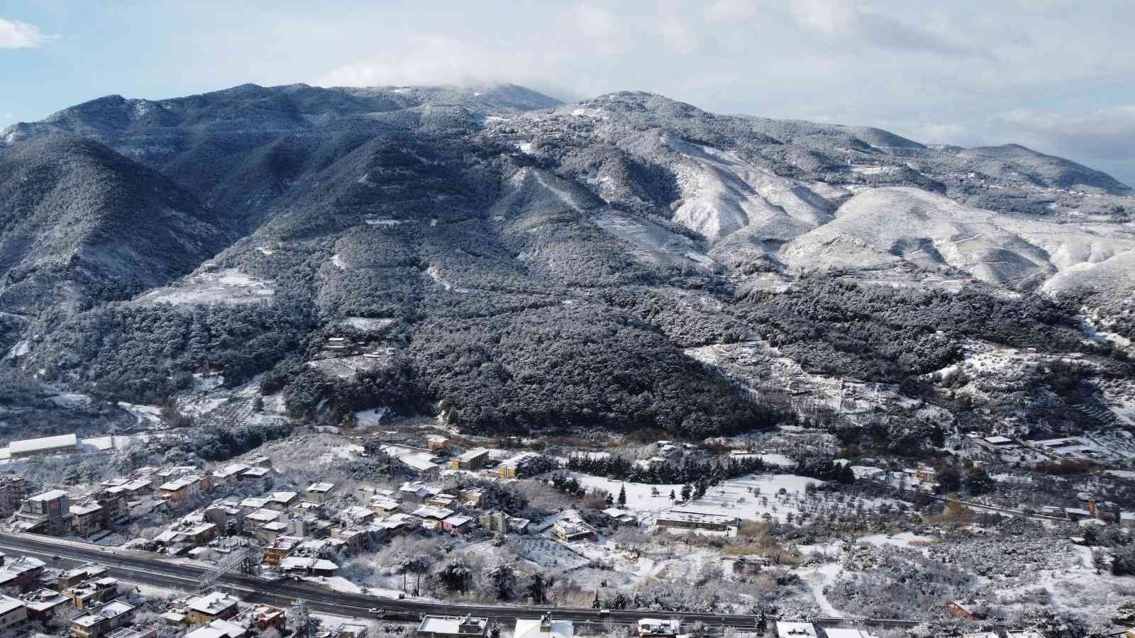 Hatay’ın Belen ilçesinde ve Amanos dağlarına yağan kar ile oluşan kartpostallık görüntüler drone ile görüntülendi.