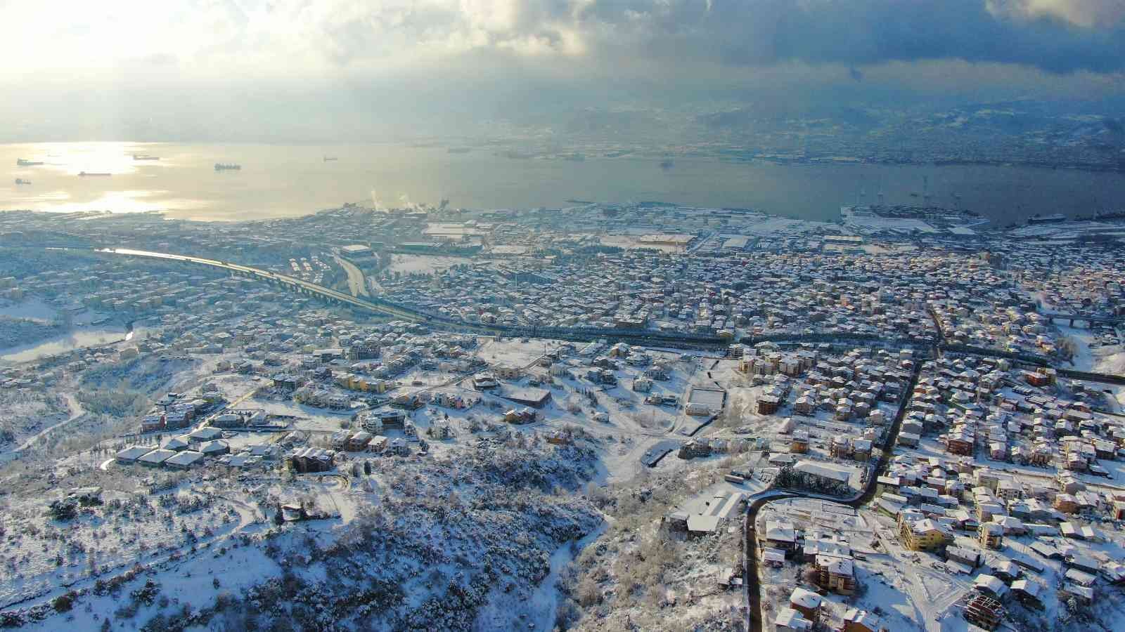 Kocaeli’de etkili olan kar yağışı kenti adeta beyaza bürürken, eşsiz manzara havadan görüntülendi.
