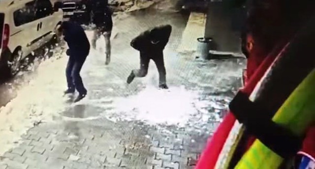 Olay, Yeşil Mahalle Taşkent Caddesi’nde meydana geldi. Müşteriye çay götüren 1’i garson 3 kişi kaldırımda yürüdüğü sırada 7 katlı apartmanın çatısında biriken kar kütlesi üzerlerine doğru düştü. Kar kütlesini son anda fark eden 3 kişi, şans eseri olaydan yaralanmadan kurtuldu. Garson, elinden düşerek kırılan bardak kırıklarını toplarken, olay anı ise apartmanın altındaki bir iş yerinin güvenlik kamerasına yansıdı.