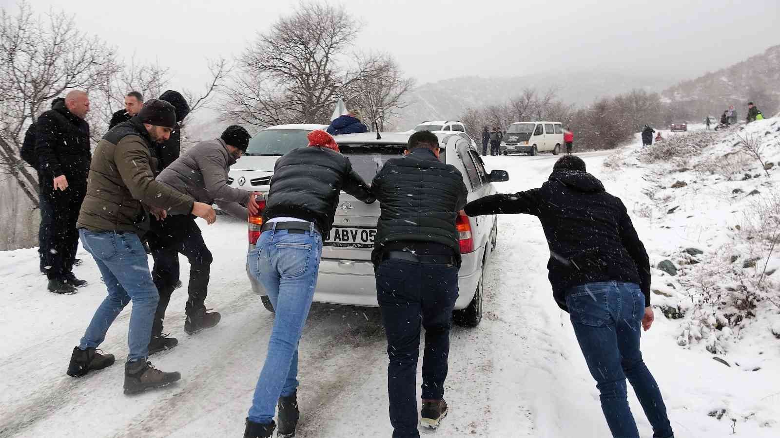 Tokat’ta kar eğlencesi için Topçam yaylasına çıkmak isteyenler kar ve buzlanma nedeniyle yolda kaldı.