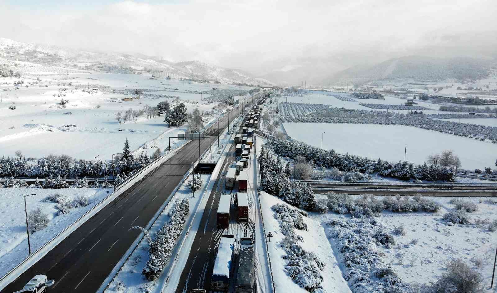 Tarsus-Adana-Gaziantep (TAG) otoyolunun Osmaniye’nin Bahçe ilçesi ve Gaziantep’in Nurdağı ilçesi kısmı yoğun kar yağışı nedeniyle ulaşıma kapandı. Ulaşıma kapanan otoyolda tırların oluşturduğu uzun kuyruk drone ile havadan görüntülendi.