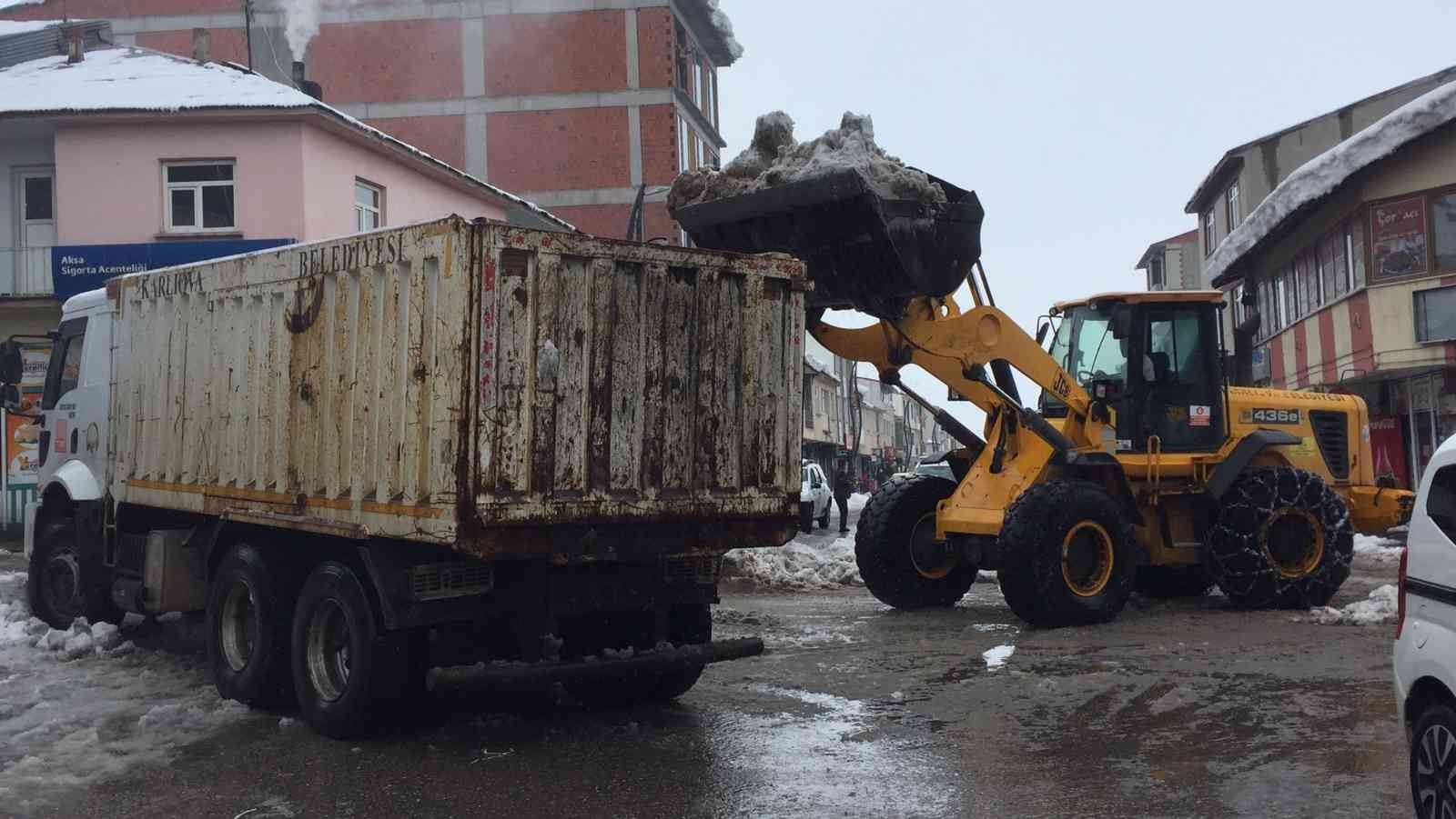 Yılın 5 ayını kar altında geçiren Bingöl’ün yüksek rakımlı ilçesi Karlıova’da, belediye ekipleri karla mücadele çalışmalarına aralıksız devam ediyor. İlçenin ana cadde ve sokaklarında biriken karları kamyonlarla ilçe dışına taşıyan ekipler, mesai mefhumu gözetmeksizin çalışıyor. Kar yağışının ilk gününden itibaren aralıksız çalıştıklarını belirten Karlıova Belediyesi çalışanı Turan Eroğlu, “Karlıova’da karla mücadele çalışmalarımız sürüyor. Gerek çatılardan düşen karları gerekse de sokaklarda biriken karları temizliyoruz. 3-4 aydır karla mücadele ekiplerimiz aralıksız bir şekilde çalışmaktadır” dedi.