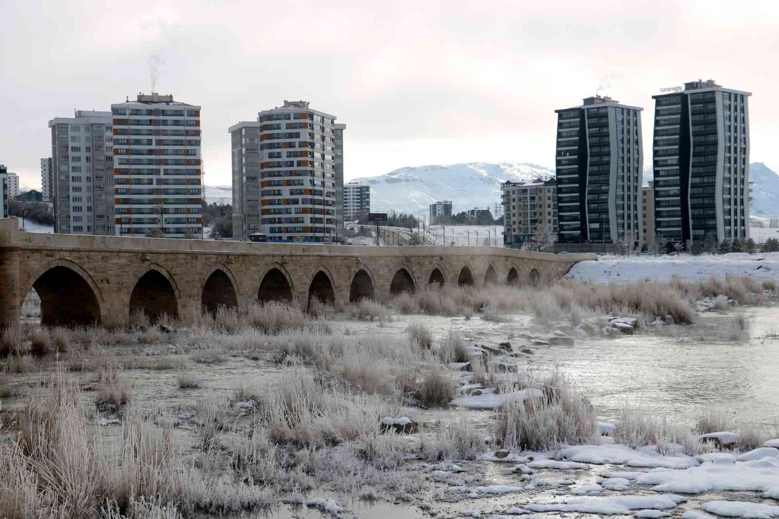 Sivas’ta soğuk havanın etkisiyle oluşan kırağı, tarihi Eğriköprü ve çevresinde kartpostallık görüntüler oluşturdu.