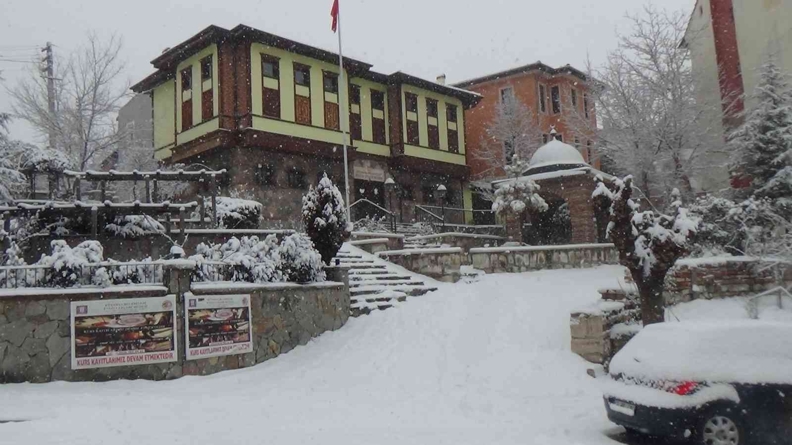 Kütahya’da karla kaplanan tarihi yapılar, ağaçlar ve parklar seyrine doyumsuz manzaralar sunuyor.
