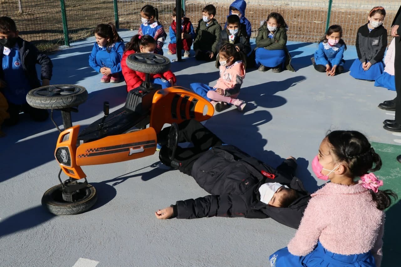 Aksaray’da minik öğrencilere uygulamalı trafik eğitimi veren jandarmanın gerçeği aratmayan eğitimi çocukları hem eğlendirdi hem de bilgilendirdi. Bir kural ihlali sonucu meydana gelen trafik kazasının canlandırılarak anlatıldığı eğitimde çocuklar yola savruldu, kullandıkları araçlar devrildi.