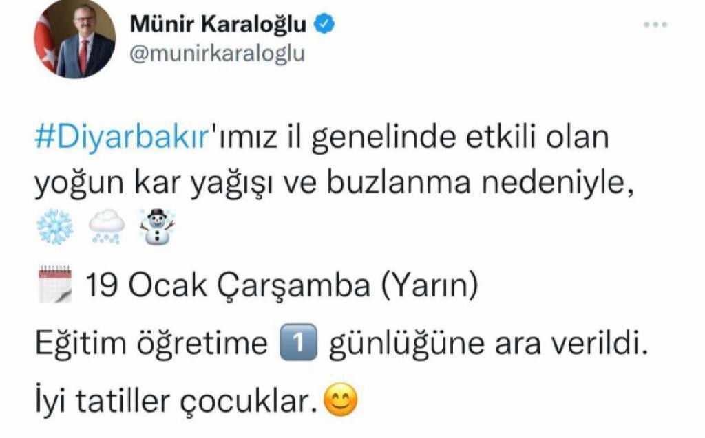 Konuya ilişkin Vali Münir Karaloğlu, sosyal medya hesabından yaptığı açıklamada, “Diyarbakır’ımız il genelinde etkili olan yoğun kar yağışı ve buzlanma nedeniyle 19 Ocak Çarşamba günü, eğitime bir gün süre ile ara verildi. Kamu kurum ve kuruluşları çalışanlarımızdan hamile, engelli, diyaliz hastaları ile kalp ve böbrek yetmezliği, kanser vb. kronik ağır hastalığı olan memur ve diğer kamu görevlilerimiz, 19 Ocak Çarşamba günü bir gün süre ile idari izinli sayılacaklar” ifadelerine yer verdi.