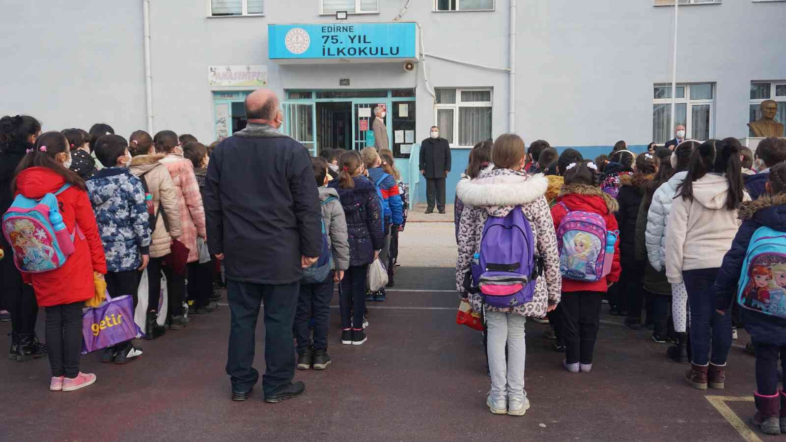Tüm yurtta olduğu gibi Edirne’de de iki haftalık yarıyıl tatilinin ardından 2021-2022 eğitim öğretim yılı ikinci döneminin ilk ders zili bugün çaldı. Edirne’de ikinci dönemin başlamasıyla birlikte 75. Yıl İlkokulu öğrencileri aileleriyle birlikte sabahın erken saatlerinden itibaren okulun yolunu tuttu. Salgın tedbirleri kapsamında okulun bahçesinde bir araya gelen öğrenciler saygı duruşu ve İstiklal Marşı için sıraya girdi.