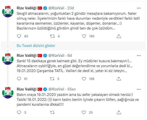 “Sevgili atmacalarım, yoğunluktan dolayı 2 gündür mesajlara bakamıyorum. Neler olmuş neler. İlçelerimizin farklı hava durumları nedeniyle verdikleri farklı tatil kararlarına sevinenler, üzülenler, kayanlar, düşenler, donanlar… Bazılarınızın üzüldüğünü gördüm şimdi ben de çok üzüldüm. Bu müdürler hepsi sizi çok sever buraları emanet ediyorum, üzmeyin atmacalarımı diyorum. İşlerini o kadar iyi yapıyorlar ki, biz ne yapar ne eder öğrencileri okulsuz bırakmayız diyorlar. Ben de ‘atmacalarım şartlar elverse siz gitmeyin deseniz bile okullarını ihmal etmez’ diyorum. Ey müdürler kusura bakmayın. Atmacalarımın oy birliğiyle, en güzel değerlendirme ve yorumlarla dedi ki; 19 Ocak 2022 Çarşamba tatil. Valileri dedi ki, yeter ki siz isteyin. Karın tadını benim için çıkarın lütfen, sağlığınıza ve pandemi kurallarına dikkat! Ve sizden son ricam; bu karda, buzda sizler için 24 saat köy yollarında fedakarca çalışan özel idare ekiplerimize ve kış koşullarıyla mücadele eden tüm görevlilerimize dua edin, özellikle gıda bulamayan hayvan dostlarımızı unutmayın.”
