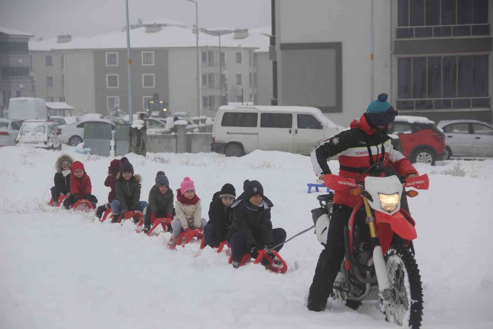 Erzincan merkez Menderes Mahallesi’nde yaşayan çocuklar, kros motorunun arkasına bağlanan kızaklarla kar keyfi yaşadı. Motosikletin arkasına kızakları bağlayan motosiklet tutkunu Canser Atila, kızağa binen çocukları kar üzerinde kaydırarak keyifli anlar yaşattı. Beklenen kar yağışının geçte olsa yağması sonrası Canser Atila isimli vatandaş evlerinde sıkılan çocukları eğlendirmek için farklı bir yol buldu. Kros motorunun arkasına bağladığı kızak ile mahalle içerisinde bulunan boş bir arazide çocukları kaydırarak eğlendirdi. Çocuklar tarafından talebin artması üzerine arkadaşlarından yardım isteyen motosiklet tutkunu Atila, gelen arkadaşıyla birlikte mahallede ki bütün çocukları kızaklara bindirerek eğlenceli vakit geçirmelerini sağladı.
