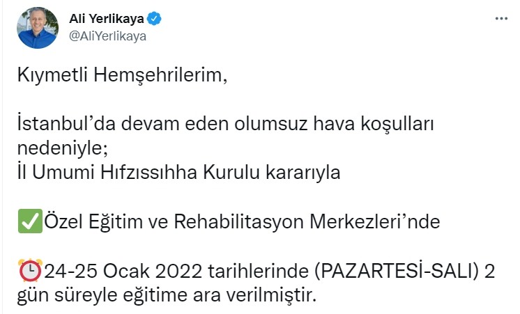İstanbul Valisi Ali Yerlikaya sosyal medya hesabından yaptığı paylaşımda İl Umumi Hıfzıssıhha Kurulu kararınca özel eğitim ve rehabilitasyon merkezlerinde 24-25 Ocak tarihlerinde 2 gün süreyle eğitime ara verildiğini duyurdu.
