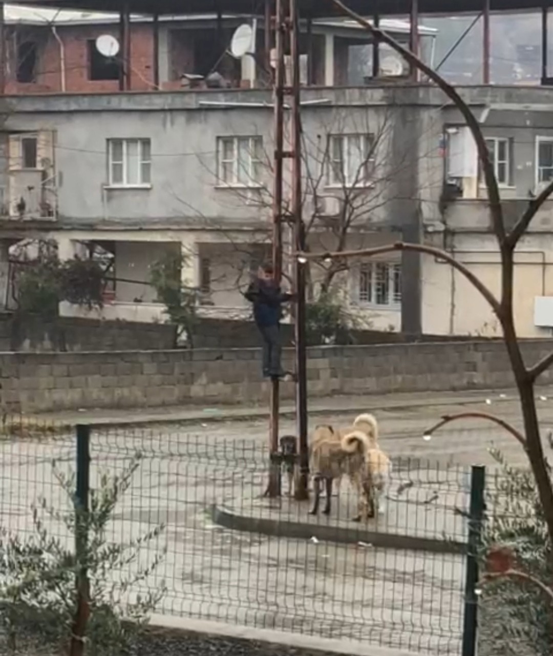 Korku ve panik yaşayan çocuk, direğin başında köpekleri ayaklarıyla kovalamaya çalıştı.