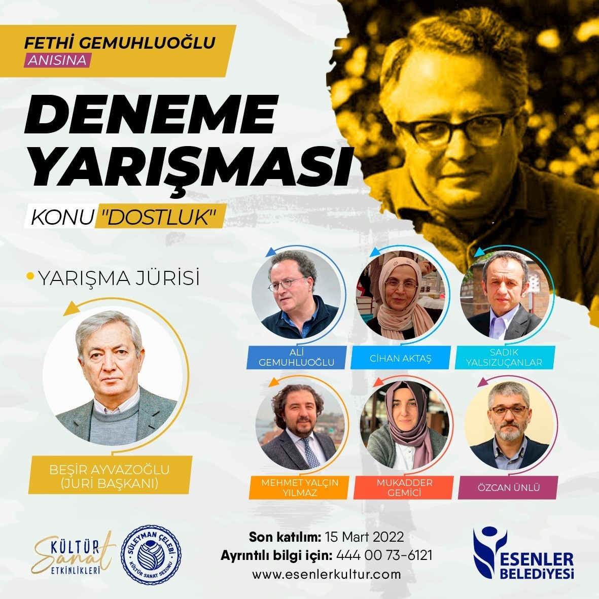 Esenler Belediyesi, hoşgörü, sevgi, dostluk kavramlarıyla gençlere rehber olan bürokrat-yazar Fethi Gemuhluoğlu’nun fikir ve medeniyet tasavvuruna dikkat çekmek ve “dostluk” kavramını yeniden keşfetmek için deneme yarışması düzenleniyor. Yarışmaya başvurular 15 Ocak 2022 – 15 Mart 2022 tarihleri arasında yapılacak. Kaleme alınan denemeler, kultursanat@esenler.bel.tr adresine gönderilecek. Esenler Belediyesi tarafından tayin edilecek ön jüri yarışmaya katılan bütün eserleri 20 Mart 2022 – 5 Mayıs 2022 tarihleri arasında okuyacak, seçtikleri 15 denemeyi ana jürinin dikkatine sunacak. Ana Jüri tarafından 100 puan üzerinden yapılacak değerlendirmenin ardından yarışmanın sonucu 19 Mayıs 2022 tarihinde kamuoyuna açıklanacak. Sonuçlar ayrıca https://esenler.bel.tr adresinden de ilan edilecek. Yazar Beşir Ayvazoğlu’nun başkanlığında oluşan jürinin diğer üyeleri ise Ali Gemuhluoğlu, Cihan Aktaş, Sadık Yalsızuçanlar, Mehmet Yalçın Yılmaz, Mukadder Gemici ve Özcan Ünlü’den oluşuyor.