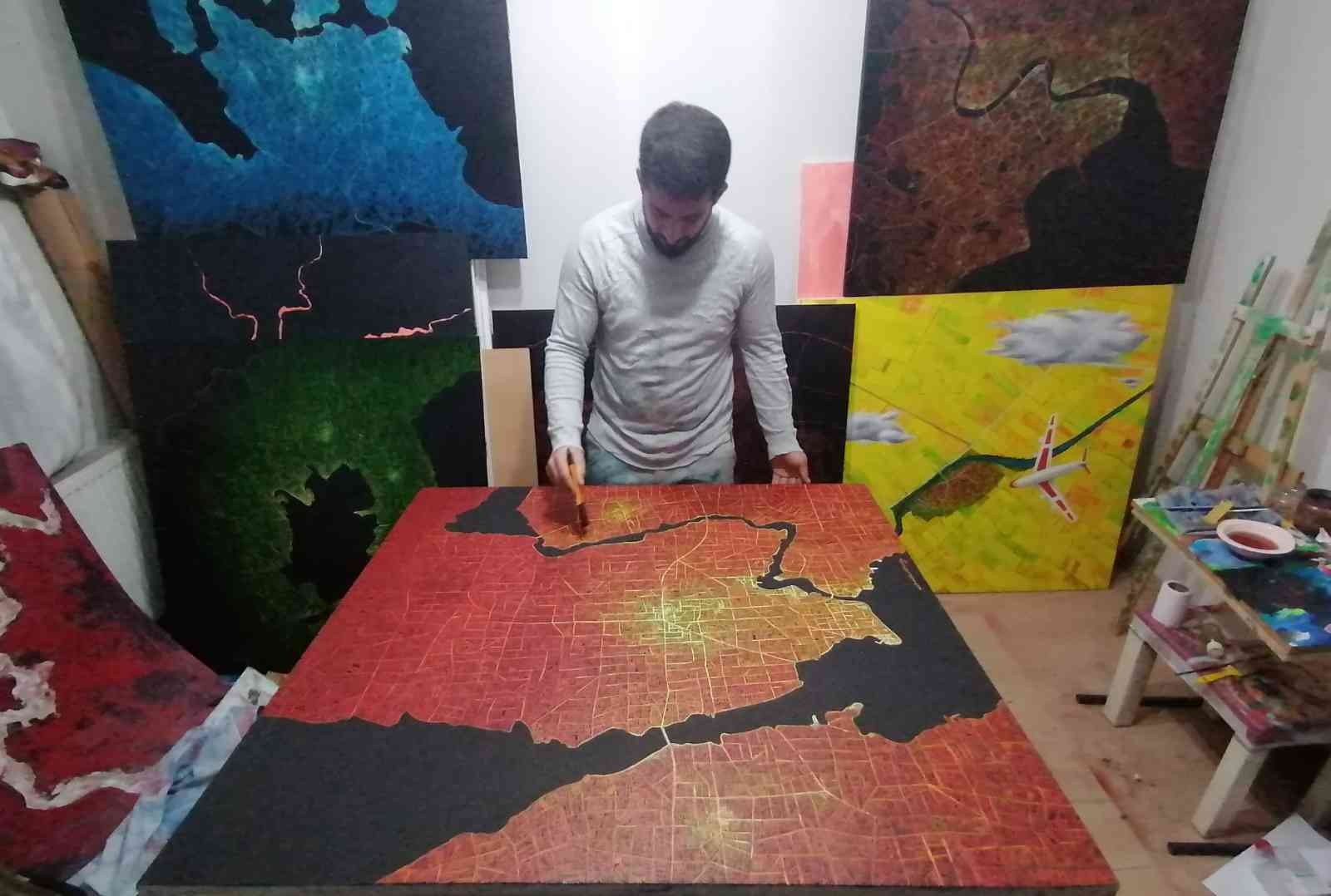 Günümüzde savaş ahlakının bozulmasının derinden etkilediğini ve bunu düzeltme çabası içerisinde sanatla farkındalık oluşturmaya çalıştığını söyleyen Ressam Erkan Kılıç (22), kuş bakışı harita gündüz, kuş bakışı harita gece, kuş bakışı tarlaları resmediyor.