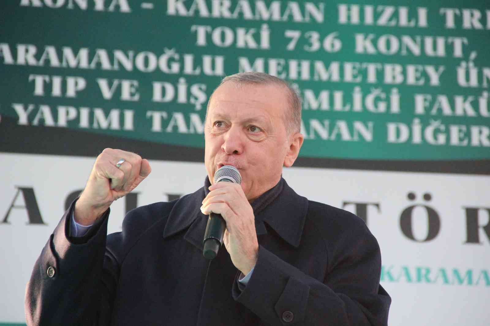 “Hayatımız boyunca hep halka hizmet Hakka hizmettir dedik. Bu anlayışla çalıştık. Bizim hedefimiz büyük ve güçlü Türkiye’yi inşa etmektir. Ülkemizi dünyanın en iyi 10 ekonomisine sokmak için bütün gücümüzle çalışıyoruz. Ülkemize kazandırdığımız güçlü demokrasi ve kalkınma alt yapısı üzerinde tüm bunları da gerçekleştireceğiz. Dünya yeni ve tarihi bir değişimin sancılarını çekiyor. Finansal saldırılar ve korona virüsle tamamen gün yüzüne çıkan bu değişime tüm gücümüzle çalışıyoruz. Ülkemizin önünü kestiler, darbeler, vesayetlerle ayağımıza prangalar vurdular. Türkiye’yi kendi içine kapatmak için tuzaklar kurdular. Menderes’ten Özal ve Erbakan’a kadar bir şekilde saf dışı bıraktılar. AK Parti’nin 20 yıla yaklaşan iktidar döneminde bu oyunların hepsiyle yüzleştik mücadele ettik. Allah’ın yardımı ve milletin desteğiyle mücadelelerin hapsinden alnımızın akıyla çıktık. Siz destek verdiniz, yanımızda durdunuz ve eğitimden sağlığa, güvenlikten adalete, ulaşımdan enerjiye, sanayiye kadar her alanda çağ atlatacak yatırımlarla ülkemizi büyüttük. Kim derdi ki 20 yıl önce Konya’dan Karaman’a yüksek hızlı tren gelecek? İnanır mıydınız? Yaptık mı? Demek ki oluyormuş. Azmedersen olur. Karamanlı kardeşlerime bu layık. Buradan Konya’ya, Ankara’ya yüksek hızlı trenle gideceksiniz. Milletimizin hak ve özgürlük alanlarını da genişlettik” diye konuştu.
