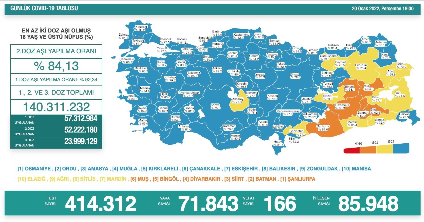 Sağlık Bakanlığı tarafından Türkiye’nin yeni korona virüs tablosu açıklandı. 20 Ocak’ta açıklanan 24 saatlik verilere göre 71 bin 843 vaka tespit edildi. Virüs nedeniyle hayatını kaybedenlerin sayısı 166 oldu. Bir günde toplam 418 bin 253 test yapılırken, iyileşen hasta sayısı 85 bin 948 olarak kaydedildi. Sağlık Bakanlığı tarafından açıklanan tabloda, 2 doz aşılama verilerine de yer verildi. En az 2 doz aşı olmuş 18 yaş üzeri nüfusu kapsayan verilere göre Türkiye’de 2. doz aşılama ortalaması yüzde 84,13 oldu. 1. doz ortalaması yüzde 92,34 olurken, 1., 2. ve 3. doz aşısını olan vatandaş sayısı toplamda 140 milyon 311 bin 232’e yükseldi.