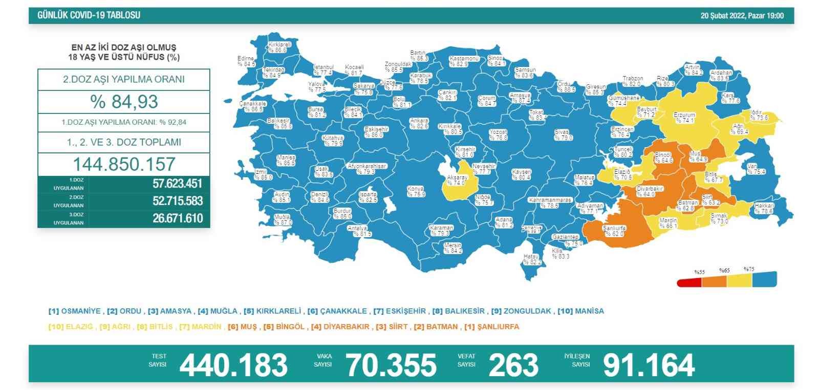 Sağlık Bakanlığı tarafından Türkiye’nin yeni korona virüs tablosu açıklandı. 20 Şubat’ta açıklanan 24 saatlik verilere göre, 70 bin 355 vaka tespit edildi. Virüs nedeniyle hayatını kaybedenlerin sayısı 263 oldu. Bir günde toplam 440 bin 183 test yapılırken, iyileşen hasta sayısı 91 bin 164 olarak kaydedildi. Sağlık Bakanlığı tarafından açıklanan tabloda, 2 doz aşılama verilerine de yer verildi. En az 2 doz aşı olmuş 18 yaş üzeri nüfusu kapsayan verilere göre Türkiye’de 2. doz aşılama ortalama yüzde 84,93 oldu. 1. doz ortalaması yüzde 92,84 olurken, 1., 2. ve 3. doz aşısını olan vatandaş sayısı toplamda 144 milyon 850 bin 157’e yükseldi.