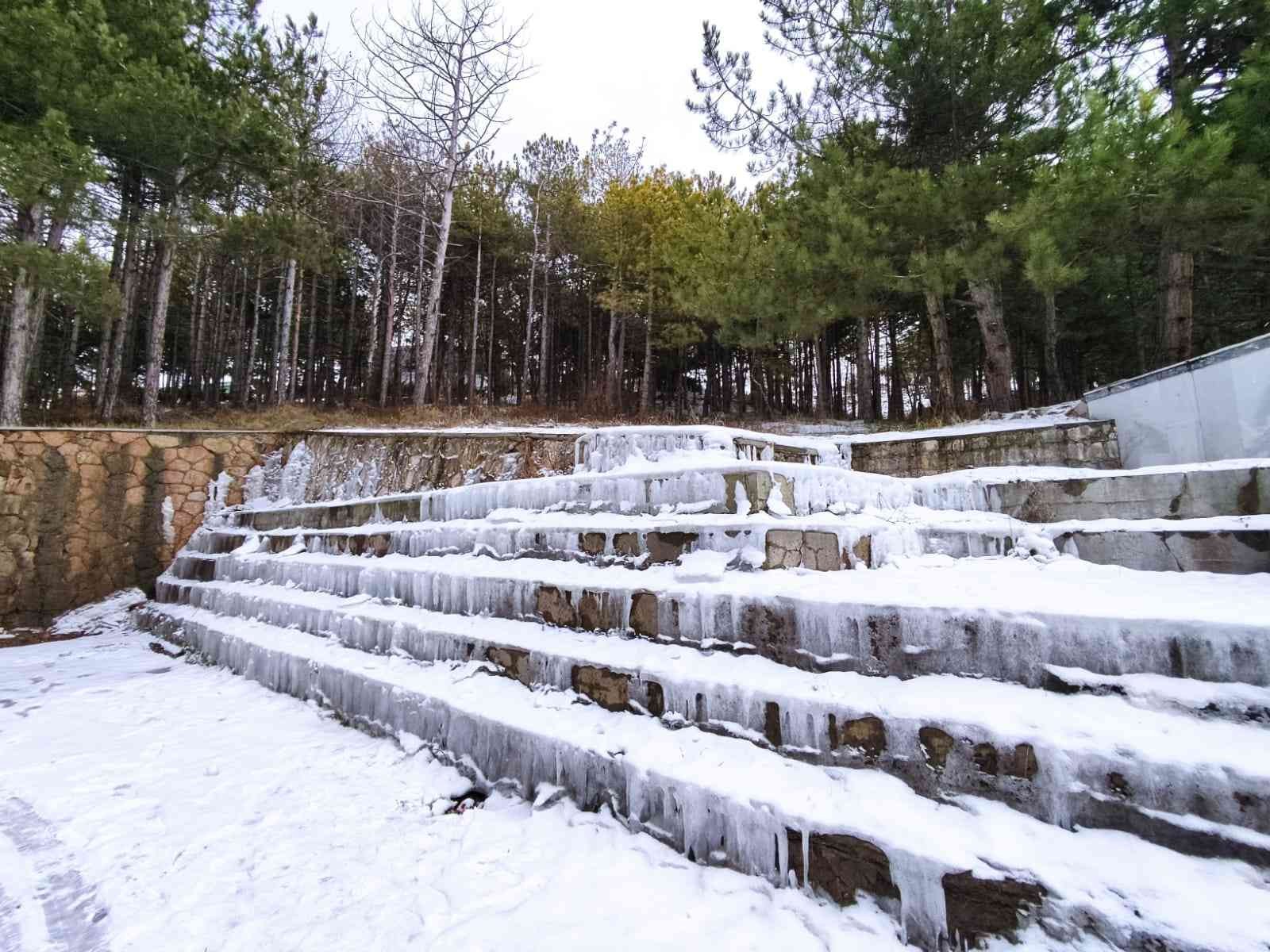 Eskişehir’de bir mesire alanının içerisinde soğuk havanın etkisiyle buz tutan amfi oturma alanı, ilginç görüntüsüyle travertenleri aratmadı …