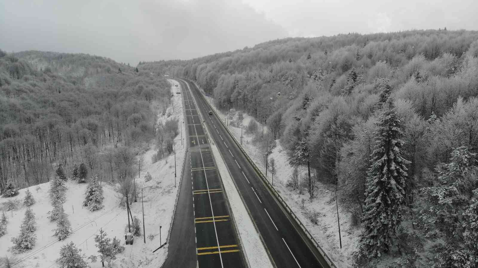 Bolu’da, dün başlayan ve aralıklarla devam eden kar yağışıyla birlikte beyaz örtüyle kaplanan Bolu Dağı’nın kartpostallık manzarası havadan …