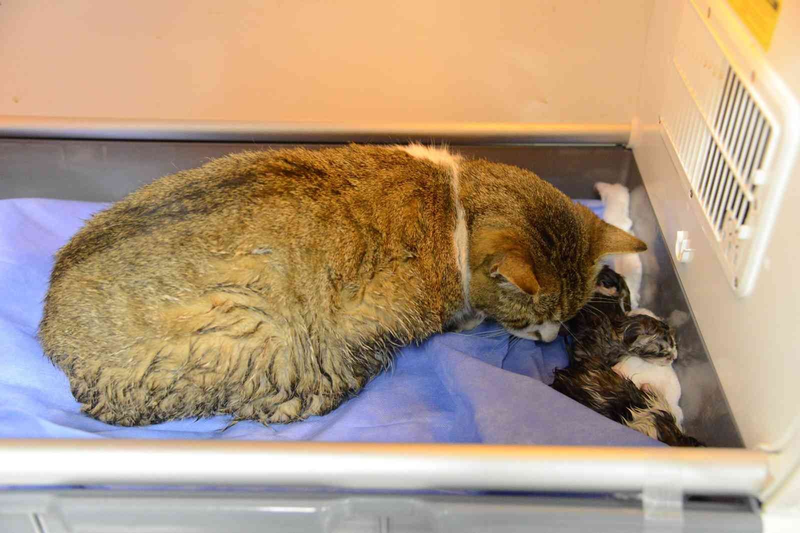 Diyarbakır Büyükşehir Belediyesi Hayvan Bakımevi ve Rehabilitasyon Merkezinde doğum yapmakta güçlük çeken kedi, yapılan sezaryenle 3 sağlıklı …