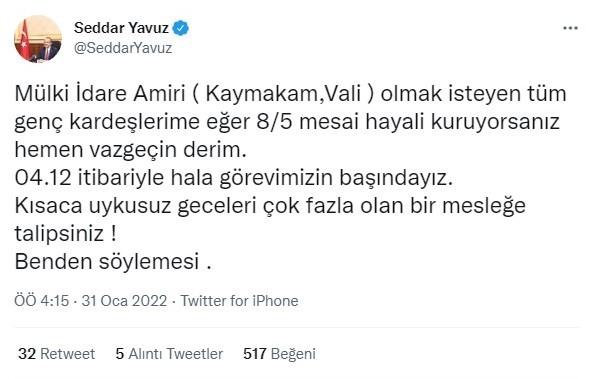 Kocaeli Valisi Seddar Yavuz, sosyal medya hesabından yaptığı paylaşımda, “Mülki idare amiri (kaymakam, vali) olmak isteyen tüm genç kardeşlerim …
